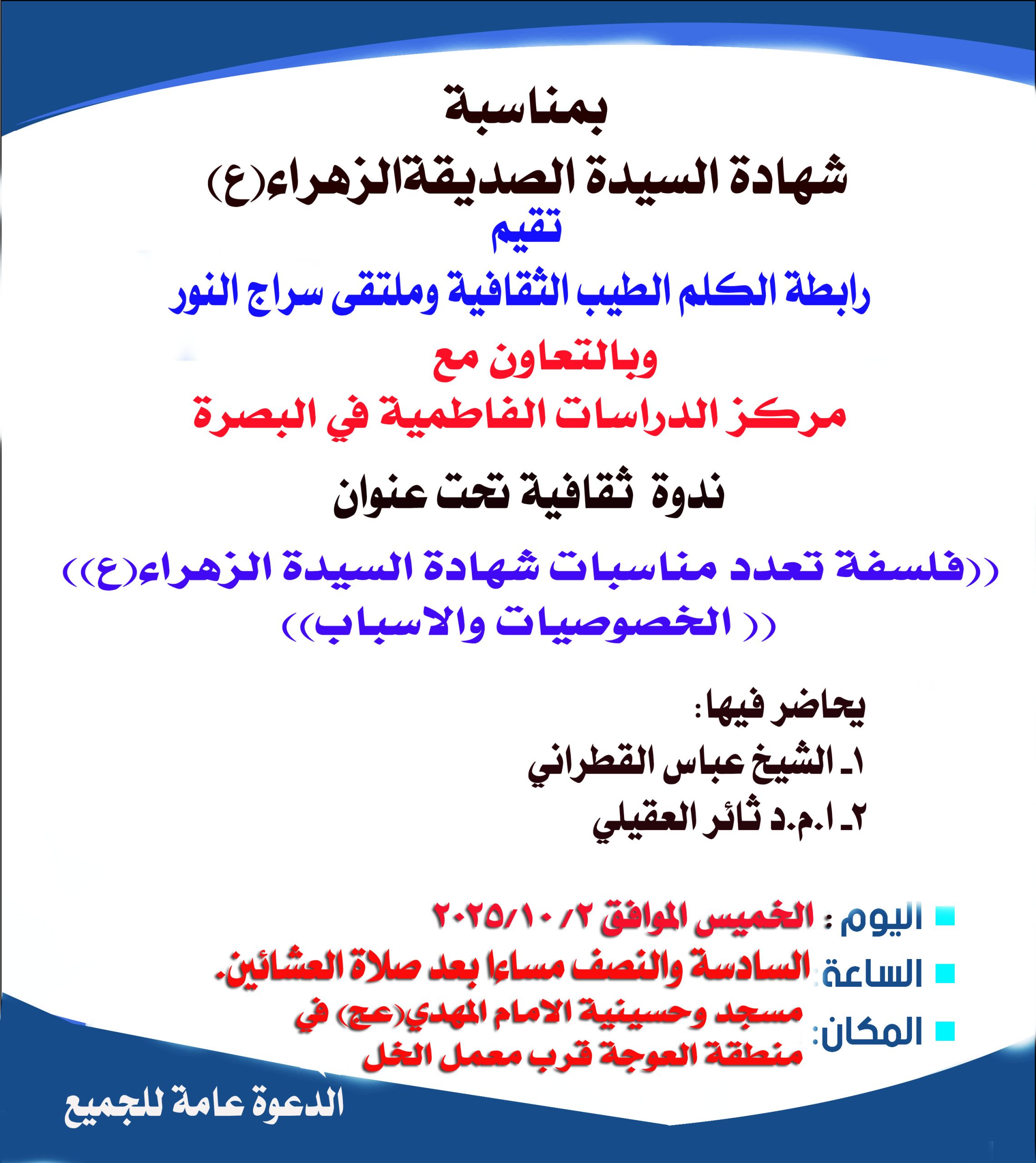 اقام مساء اليوم الاربعاء 2025/10/8 مركز الصادقين للدراسات والبحوث ندوة فكرية بعنوان((فاطمة الزهراء(ع) المرجعية الفكرية في بناء الوعي المجتمعي )) حاضرها فيها كل من أ.م.د ثائر هادي العقيلي / مدير مركز الدراسات الفاطمية في البصرة ود. فراس كاظم القطان . في حسينية الصادقين في التنومه