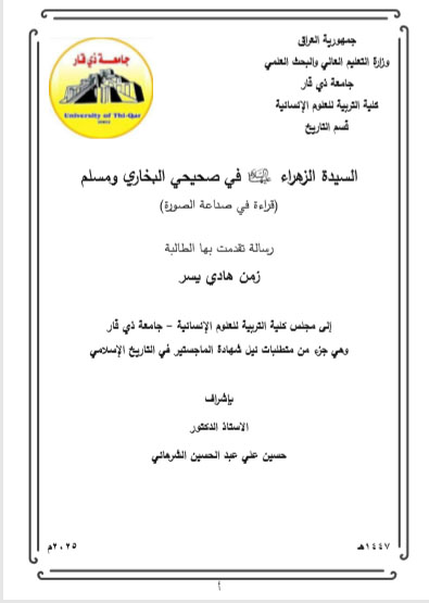 رسالة ماجستير ((اسيدة فاطمة الزهراء(ع) في صحيحي البخاري ومسلم ( قراءة في صنع الصورة)/البحثة زمن هادي يسر
